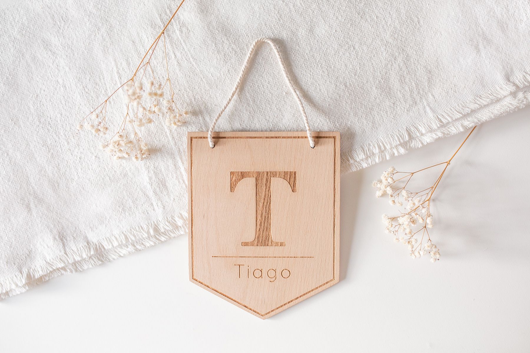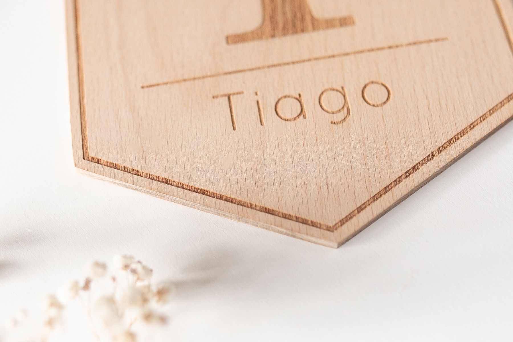 Fabricado en madera de haya natural de 4mm de espesor, con cordón de macramé de algodón. El tamaño del banderín es de 19 cm de alto y de 15 cm de ancho, grabada con láser de alta calidad.