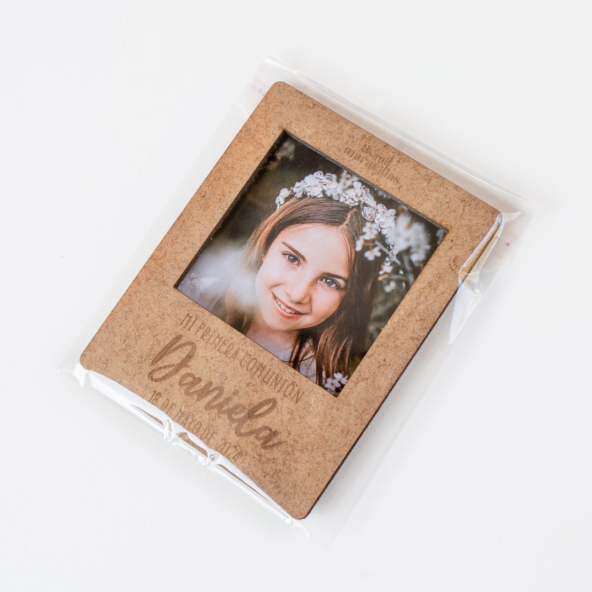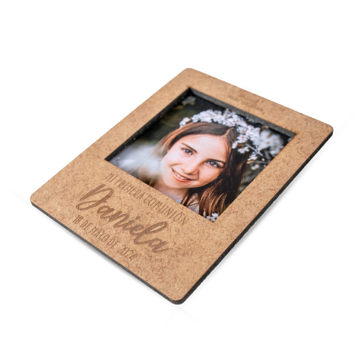 Fabricado en madera reciclada DM de 3mm de espesor. Su tamaño es de 11cm x 8.5cm (el marco de la foto ocupa 6 x 6cm, ideal para fotos de 7cm x 7cm), grabado con láser de alta calidad.