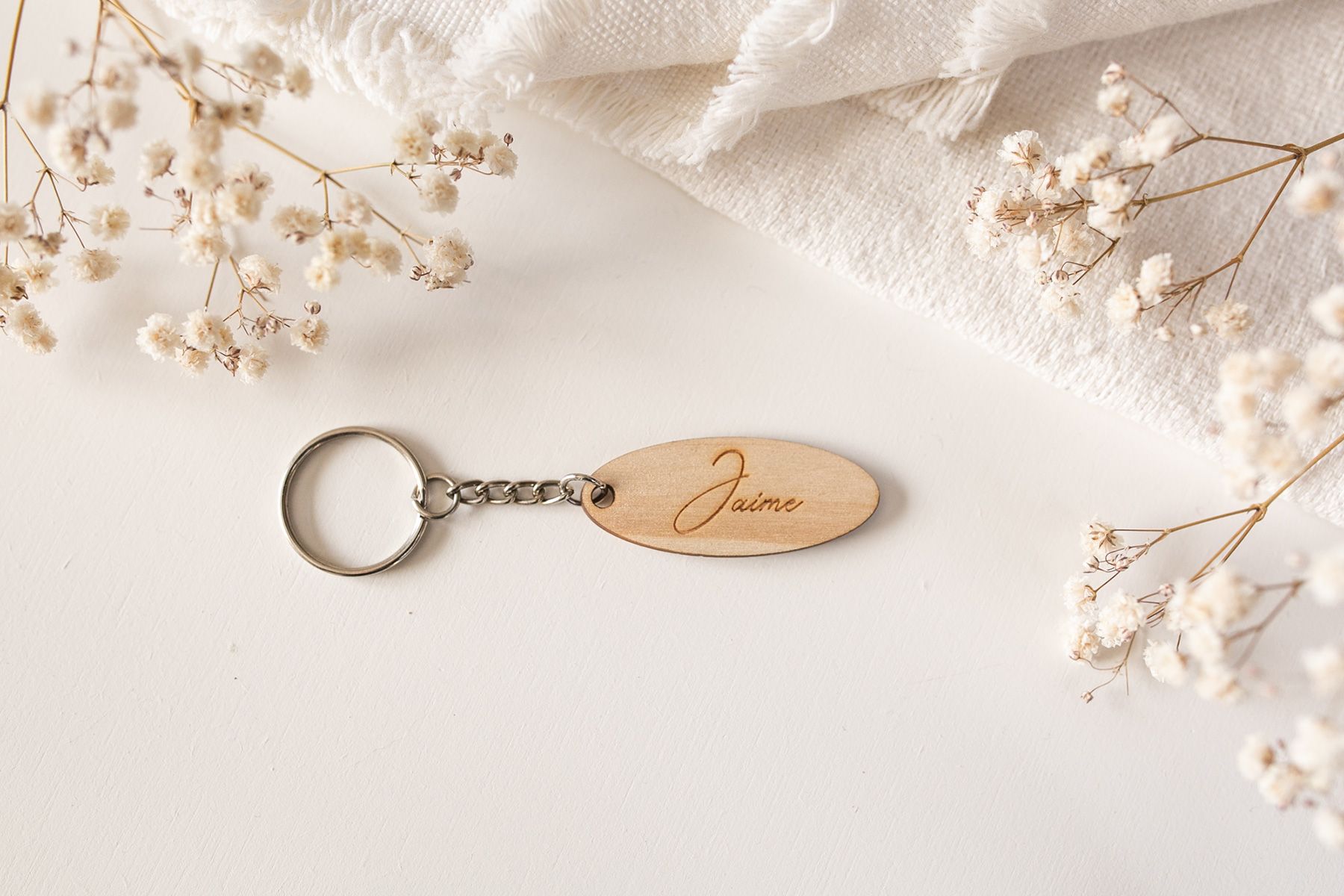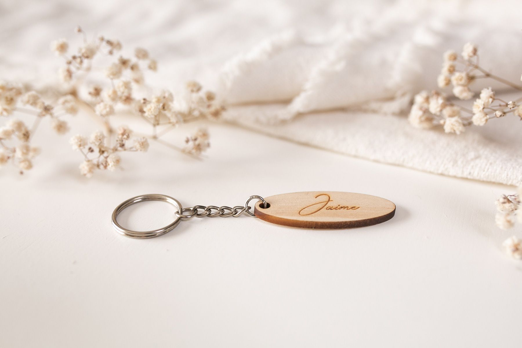 Fabricado en madera de pino natural de 3mm de espesor. El tamaño del llavero es de 2 cm de alto y de 5 cm de ancho. Corte y grabado láser de alta calidad.